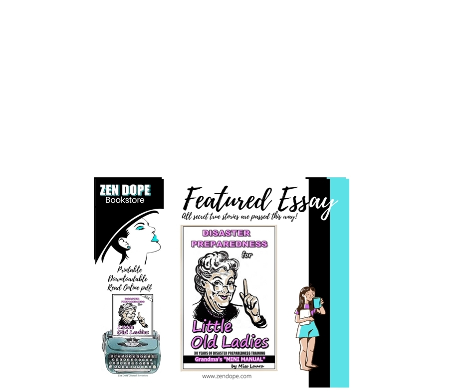 A 9860 word and 32 page Mini Manual. Caring, timely and needed! "DISASTER PREPAREDNESS for Little Old Ladies" is not your every day Emergency Preparedness Manual. In this skillfully composed Mini-Manual, each chapter is only ONE Page! The Information,items and gear are all inexpensive and light-weight as well as extremely well thought-out and tested. There is nothing on these pages that Grandma can not carry or can not DO! The elderly can now have THEIR Plan! A "must have" for any new prepper, small prepper or elderly prepper. Grandma needs this printable, down-loadable and e-readable Mini Manual. Step-by-step procedures and short checklists for the "elderly" within their own manageable range of resources allows the elderly and "Grandma" to better survive too. Sweetly illustrated, this personal guide with personal "fill-in" lists and phone number columns is packed with 30 years of compressed experience in the field of Disaster Preparation and Survival. Crafted specifically for the elderly or physically handicapped, but anyone can use this personal handbook! Written by Miss Laura, a regular author at the Zen Dope Bookstore!